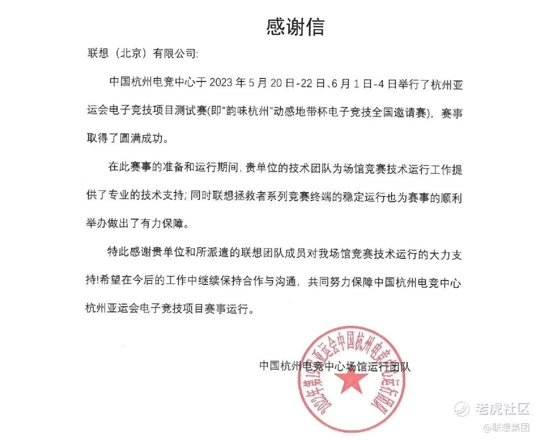 我们还收到了来自亚运会中国杭州电竞中心运行团队的感谢信,信中写道:联想的技术团队为场馆竞赛技术运行工作提供了专业的技术支持,联想拯救者系列竞赛终端的稳定运行也为赛事的顺利举办做出了有力保障。