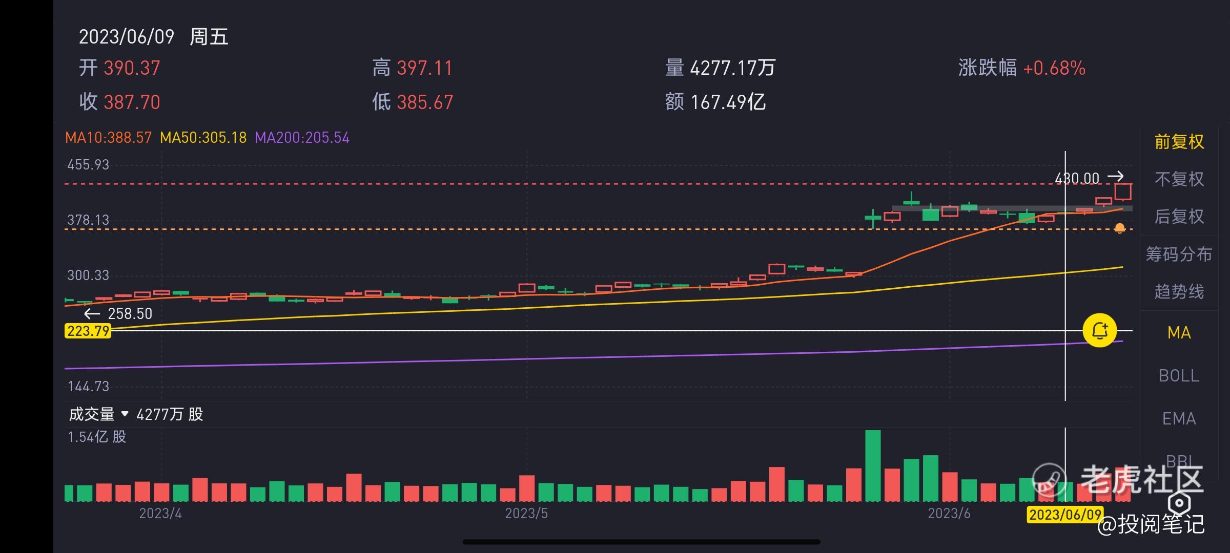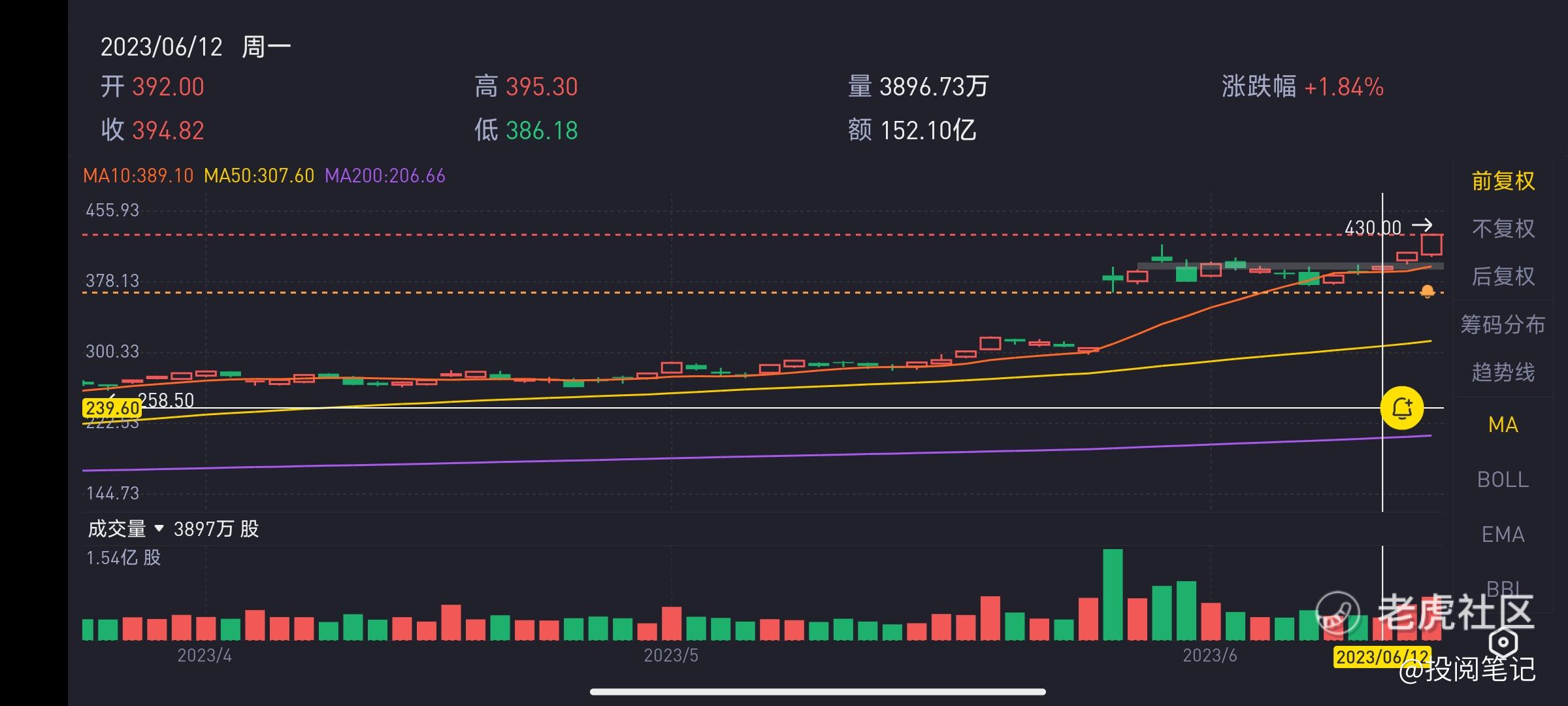 同时6月9号也跌破10日移动均线,最低点股价为385.67,我们再来看6月12号的最低点的股价为386.18,没有构成背离10日移动均线。同时股价也没有在10日移动均线以上,所以规则一暂时不满足,后面按照这个方法继续验证
