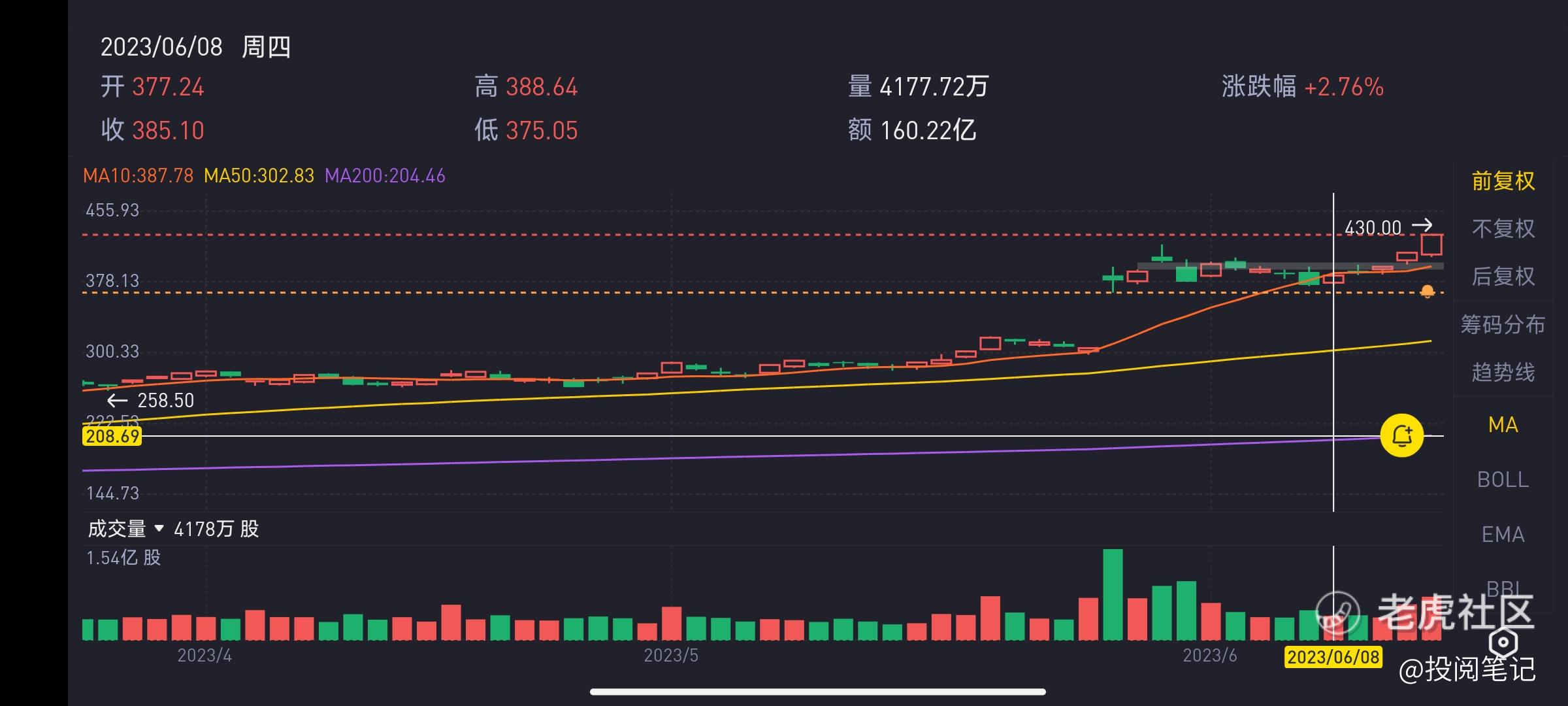 先说下规则一:买入后我们可以看到6月7日跌破10日线,最低点股价为373.56,我们再来看6月8号的最低点的股价为375.05,没有构成背离10日移动均线。