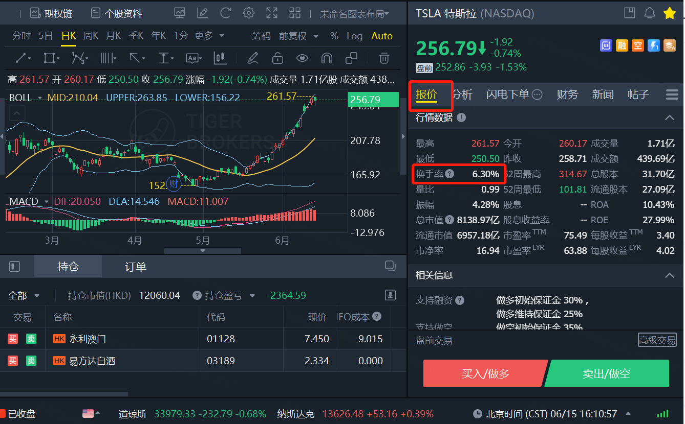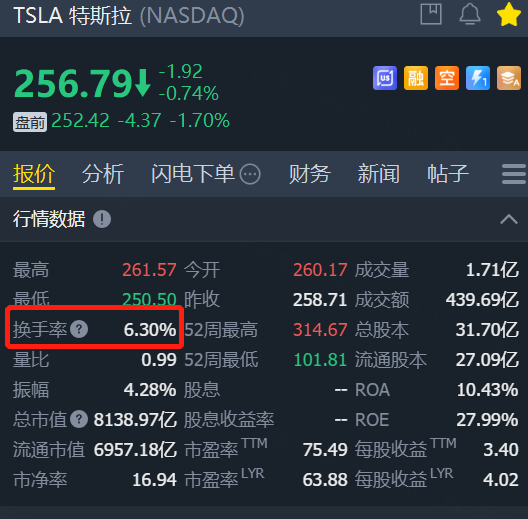 以 $特斯拉(TSLA)$ 为例,特斯拉目前的换手率为6.3%,处于活跃成交状态: