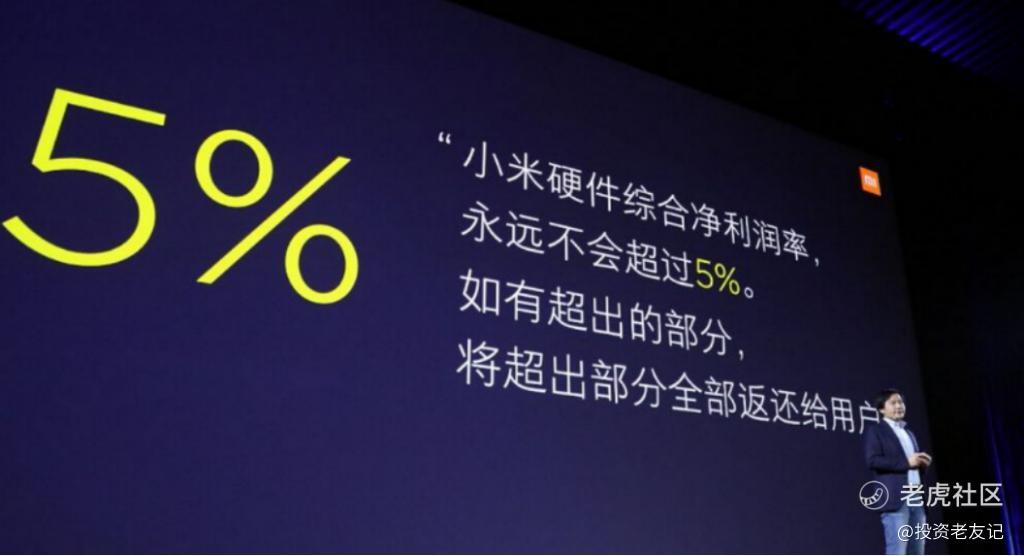 2018 年 4 月,在武汉大学举行的小米 6x 发布会上,雷军表示:" 小米公司董事会已经通过决议,从今天起,小米向用户承诺,每年整体硬件业务(包括手机及 IOT 和生活消费产品)的综合税后净利率不超过 5%,如超过,我们将把超过 5% 的部分用合理的方式返还给小米用户。"
