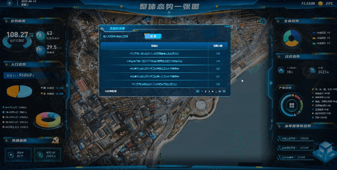 根据街道的人、地、事、物、组织等要素,海纳云建立了全方位的专题数据库群,在改平台上就能看到街道的基本情况,人口与党建态势,该样板也受到了青岛市政府的认可。
