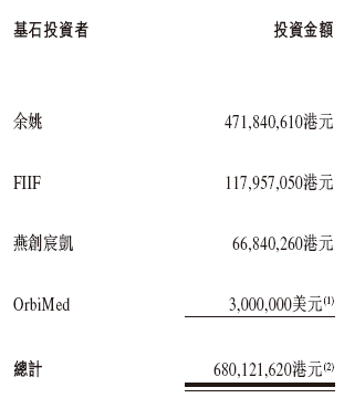 来凯医药是次IPO引入4名基石投资者,合共认购约6.80亿港元的发售股份,其中余姚阳明股权投资基金认购约4.72亿港元、先进制造产业投资基金二期认购约1.18亿港元、宁波姚商燕创宸凯认购6684.03万港元、OrbiMed认购300万美元的发售股份。