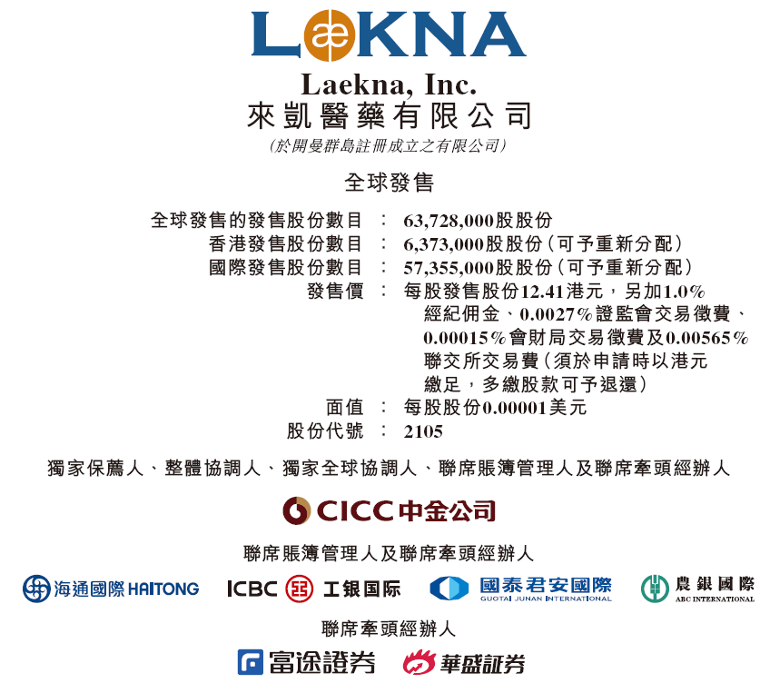 来凯医药,计划发售6372.80万股,其中90%为国际发售、10%为公开发售,无超额配股权。每股发售价12.41港元,每手500股,最多募资约7.91亿港元。