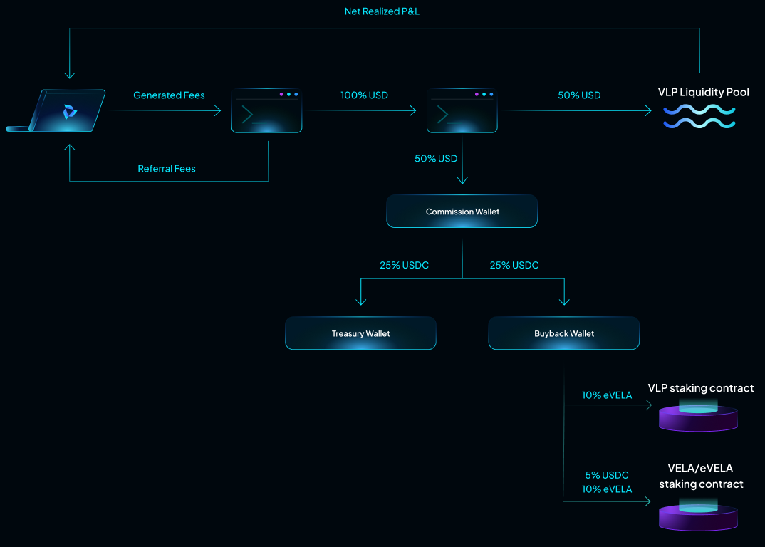 -15% 分配给 VELA 质押者(5% 以 USDC 形式,10% 以 eVELA 形式)