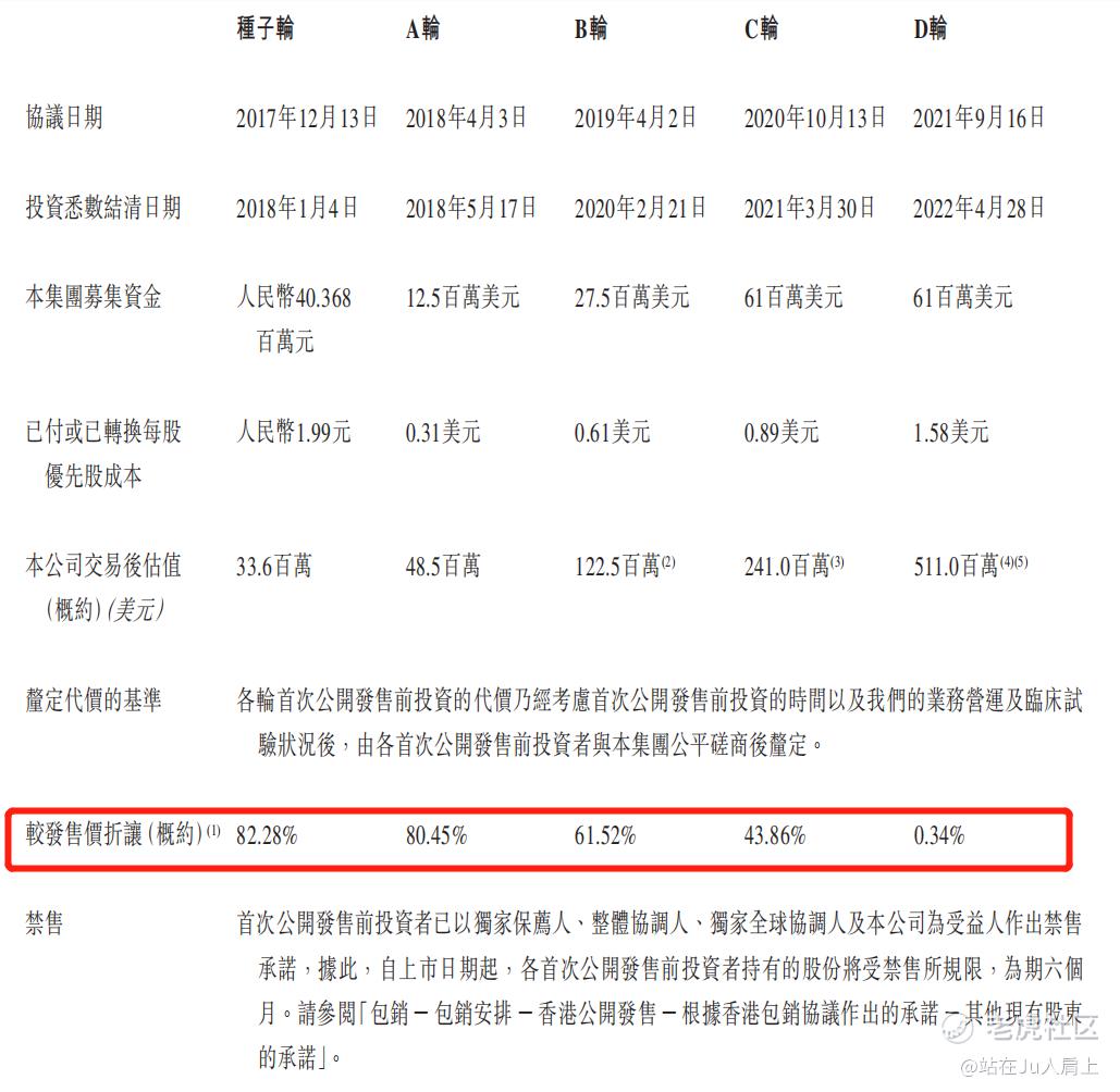 公司2017年12月至2022年4月经历了5轮融资,累计融资额为1.68亿美元,彼时发售价较中间价折价82.28至0.34%,禁售期6个月。早期投资者包括投资方包括OrbiMed(奥博资本)、国投招商、深创投等知名机构。