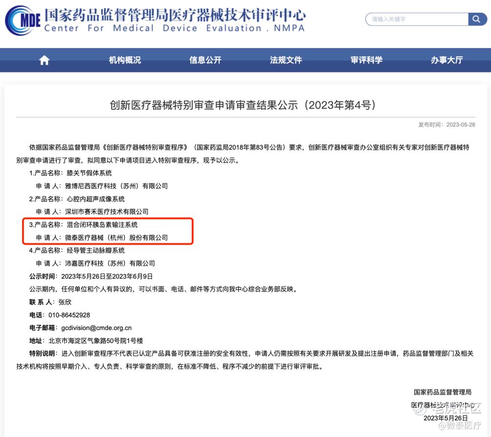 2023年6月13日,微泰医疗(02235.HK)混合闭环胰岛素输注系统(人工胰腺)进入了国家药品监督管理局(NMPA)的创新医疗器械特别审查的“绿色通道”。这是继AiDEX动泰之后,微泰医疗在糖尿病领域内第2款进入创新医疗器械特别审查“绿色通道”的自主研发创新产品。
