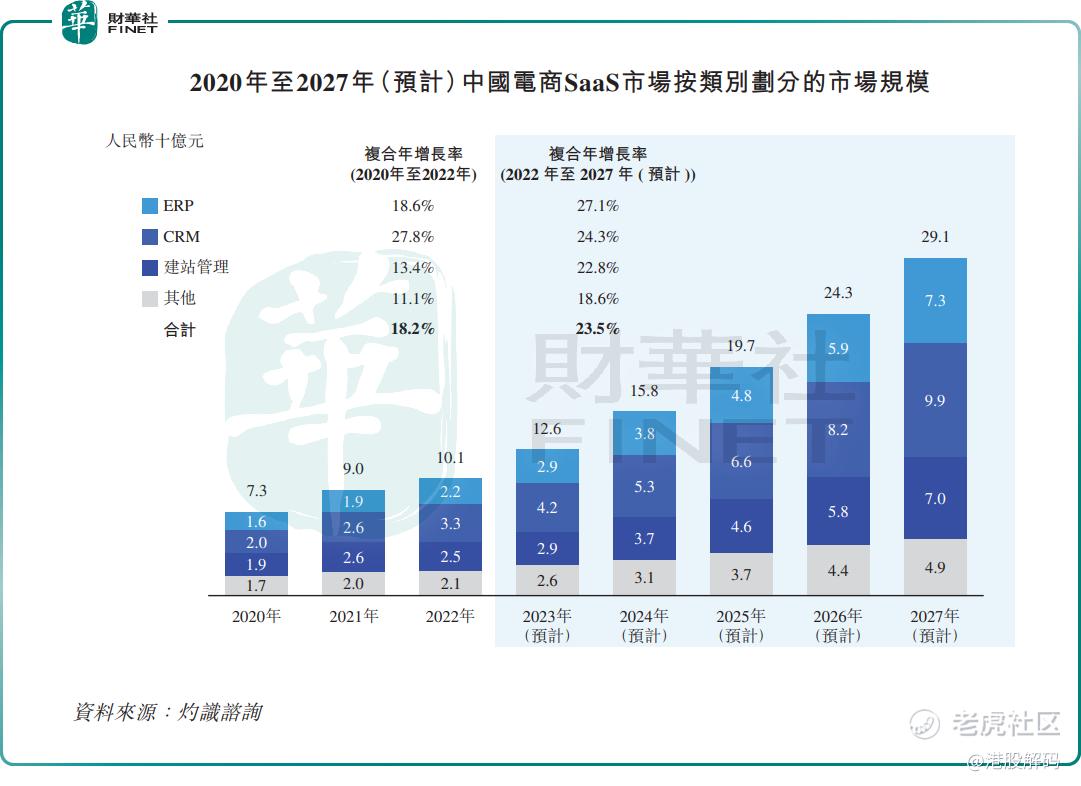 因此,我国电商SaaS ERP市场在过去三年增长迅猛,2020年-2022年复合年增长率为18.6%,预计2022年-2027年复合年增长率进一步提升至27.1%,增幅超过其他细分领域。