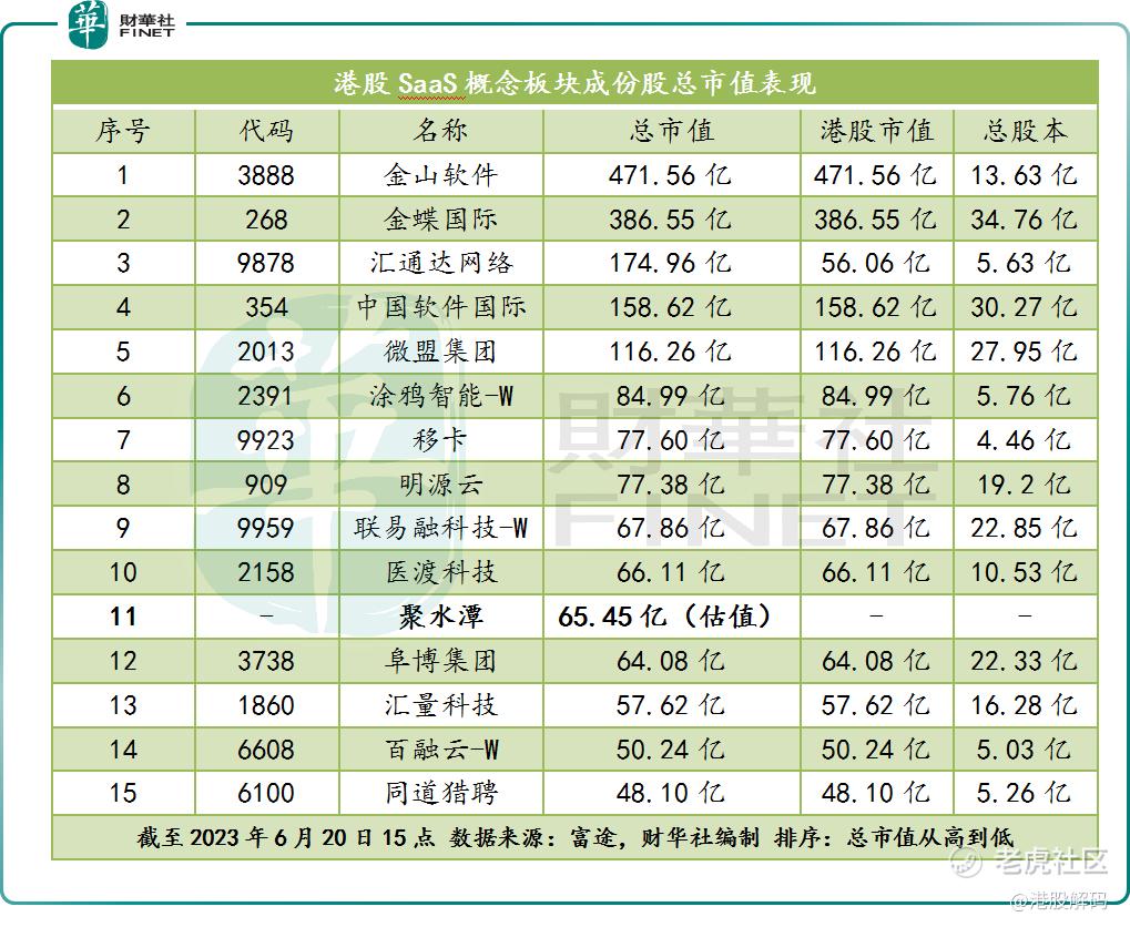 目前,60亿元人民币估值约等于65.45亿港元。按总市值排序,截至发稿前,聚水潭65.45亿港元估值可排在港股SaaS概念板块的第11位。