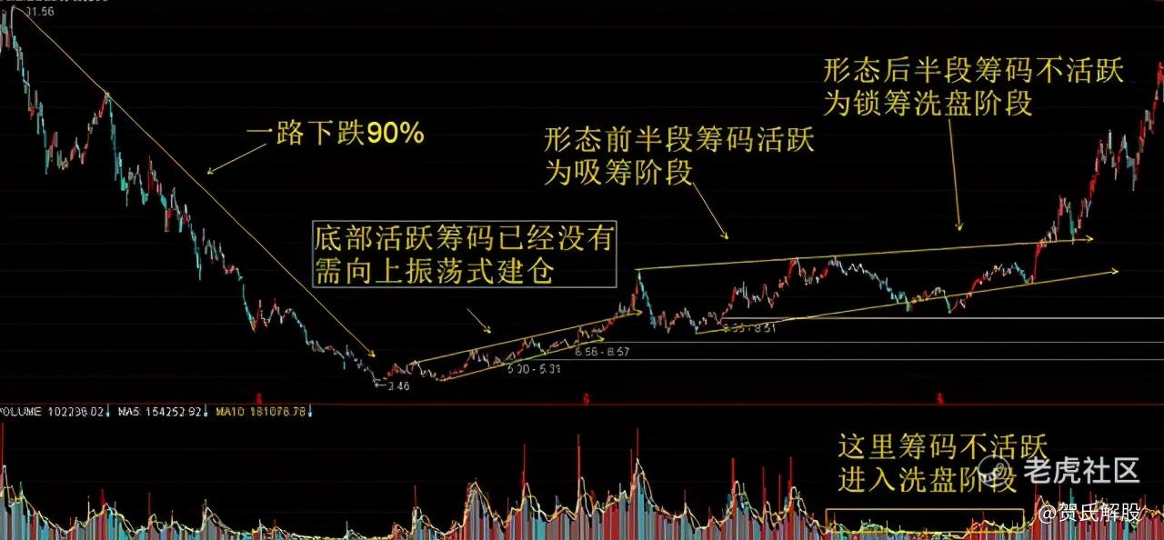 提示:如上图主力次高位出货后股价流水式下跌50%后才止跌,大部分的筹码都被套死在次高位上。只有少部分筹码是散户不断割肉留下的活跃筹码,这些筹码就是主力建仓时需要买入的。(例如:A散户在次高位10块钱买入股票,当股价下跌后止损9块卖出给B散户,股价下跌B又卖出给C散户,就是这样通过接力割肉的方式把一少部分筹码留到底部。每次下跌都会有筹码沉淀不出,导致越向下筹码越少直到活跃筹码消失就是底部)