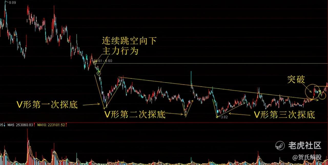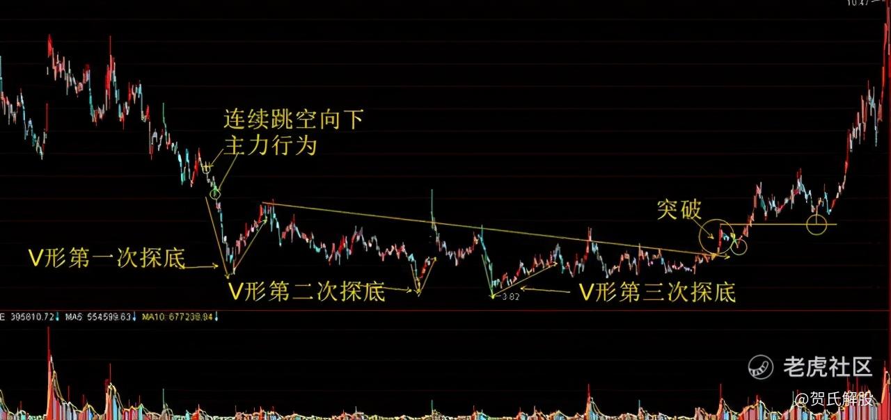 如图2 连续的跳空缺口已经说明主力进场了,因为组成K线的四个价格(开盘价、收盘价、最高价、最低价)开盘价和收盘价是主力必争的,最高价和最低价一般用于试盘,不是本章重点以后详述。跳空后即第一波流水式下跌杀伤力非常大,主要目的就是为了吓出恐慌盘直到无活跃筹码出现既反转向上吸筹。之后继续第二次第三次探底以夯实底部。(看V形底的成交量)