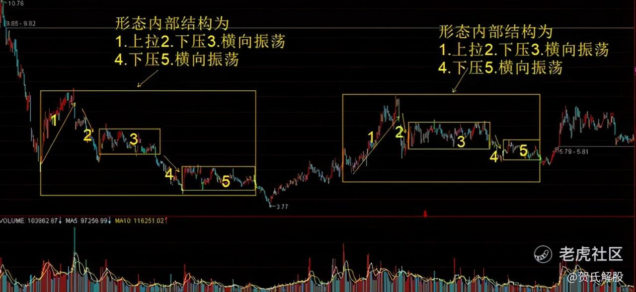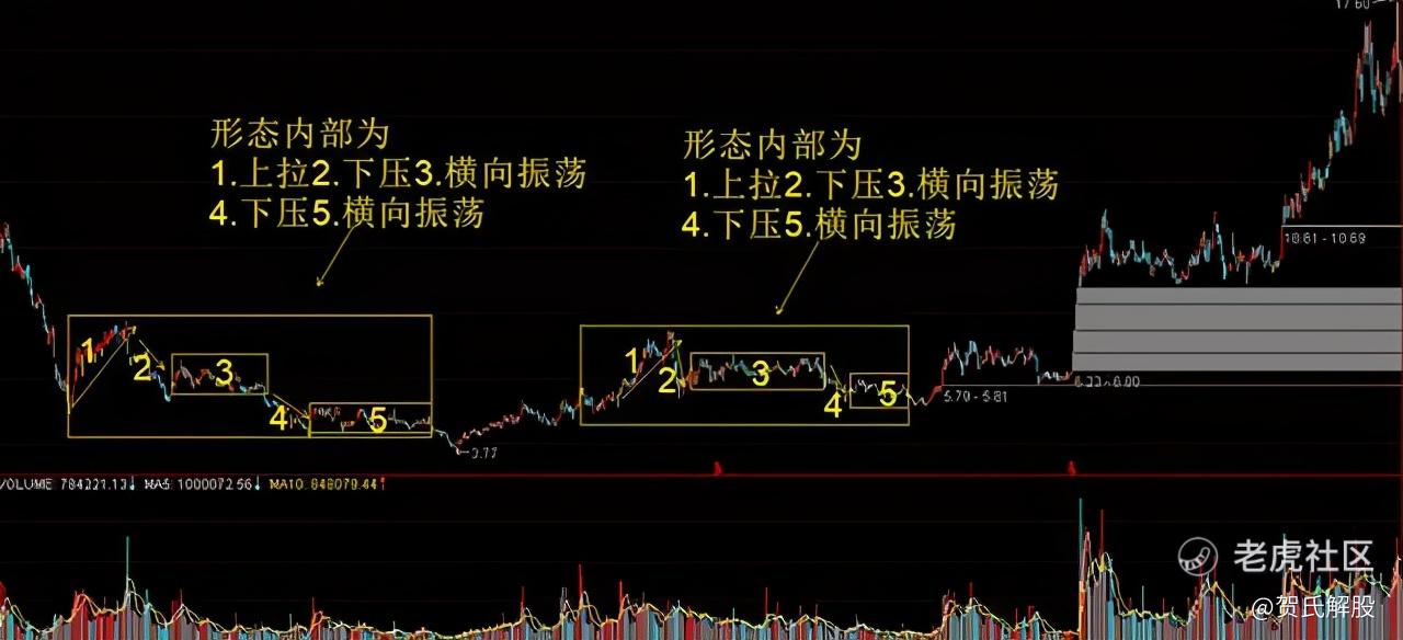 练习1答案看下图 大角度V形反转探底并且左右两个形态一模一样,右侧为左侧的缩小版。从痕迹学讲只要是人为的必然留有痕迹,只要多看多锻炼就能很快发现形态背后的东西。这也是为什么前面篇章对形态加以详述。