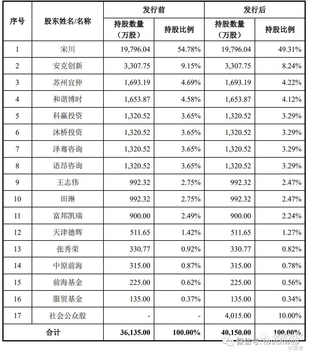 IPO后,宋川直接持股49.31%,安克创新持股8.24%,苏州宜仲持股4.22%,和谐博时持股4.12%,科赢投资、沐桥投资、泽骞咨询、语昂咨询分别持股3.29%,王志伟、田琳分别持股为2.47%;