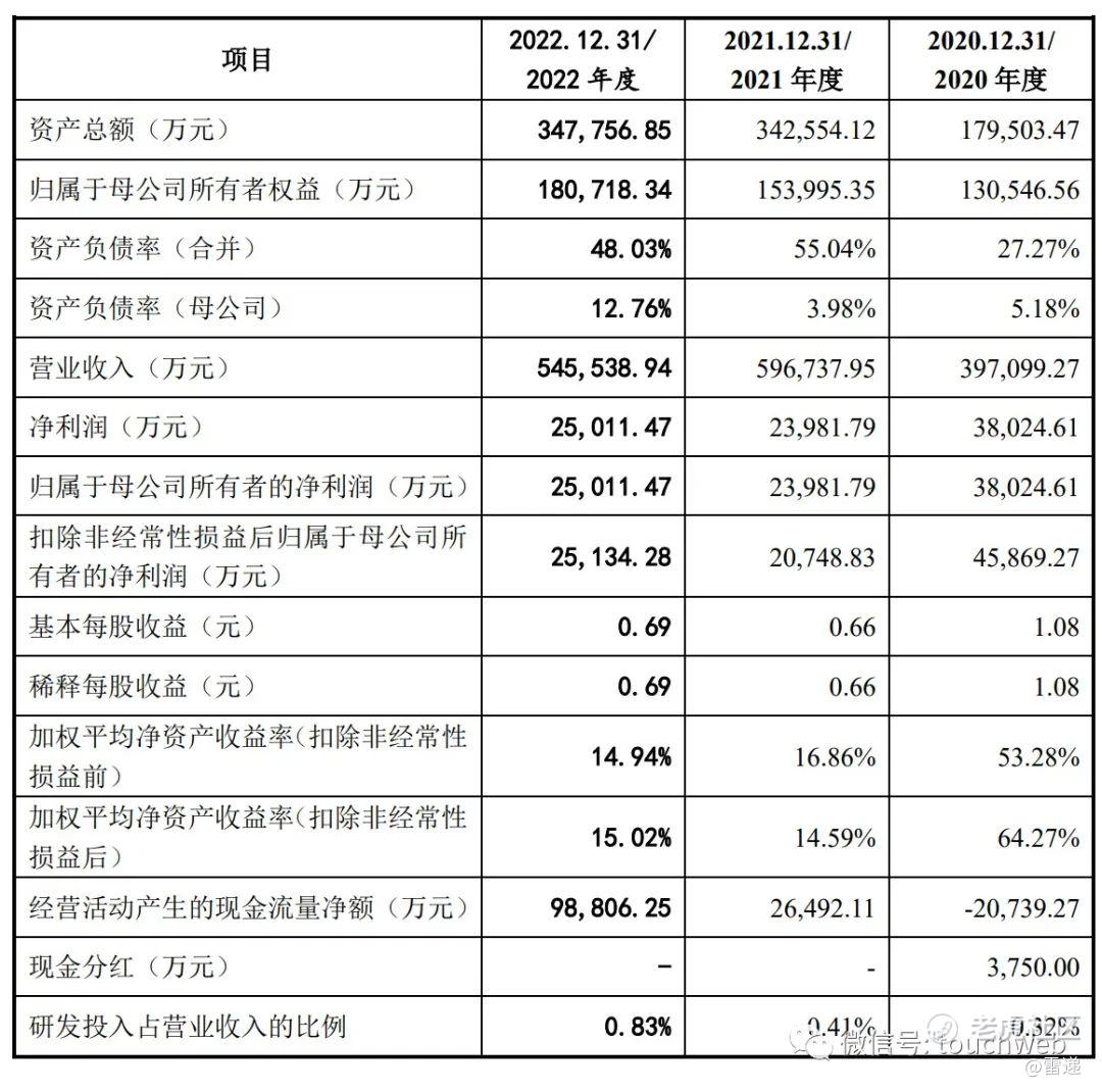 招股书显示,致欧科技2020年、2021年、2022年营收分别为39.7亿、59.67亿元、54.55亿元;净利分别为3.8亿元、2.4亿元、2.5亿元;扣非后净利分别为4.59亿元、2.07亿元、2.51亿元。