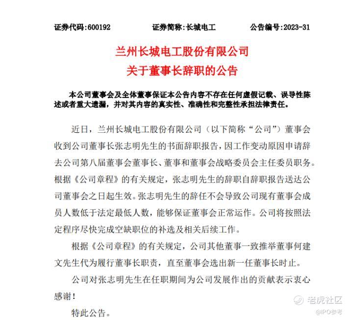 $长城电工(600192)$ 【长城电工董事长辞职】长城电工6月21日发布公告,近日,公司董事会收到公司董事长张志明的书面辞职报告,因工作变动原因申请辞去公司第八届董事会董事长、董事和董事会战略委员会主任委员职务。(公司公告)