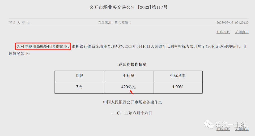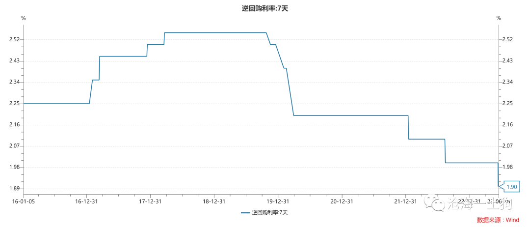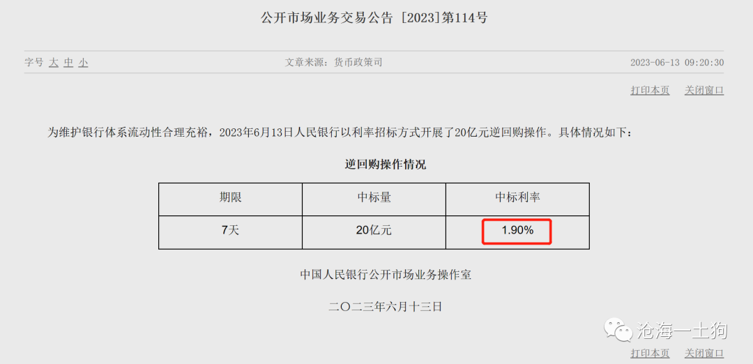2023年6月13日,央行宣布降息10bp,把公开市场7天逆回购的利率从2.0%降低到1.9%。