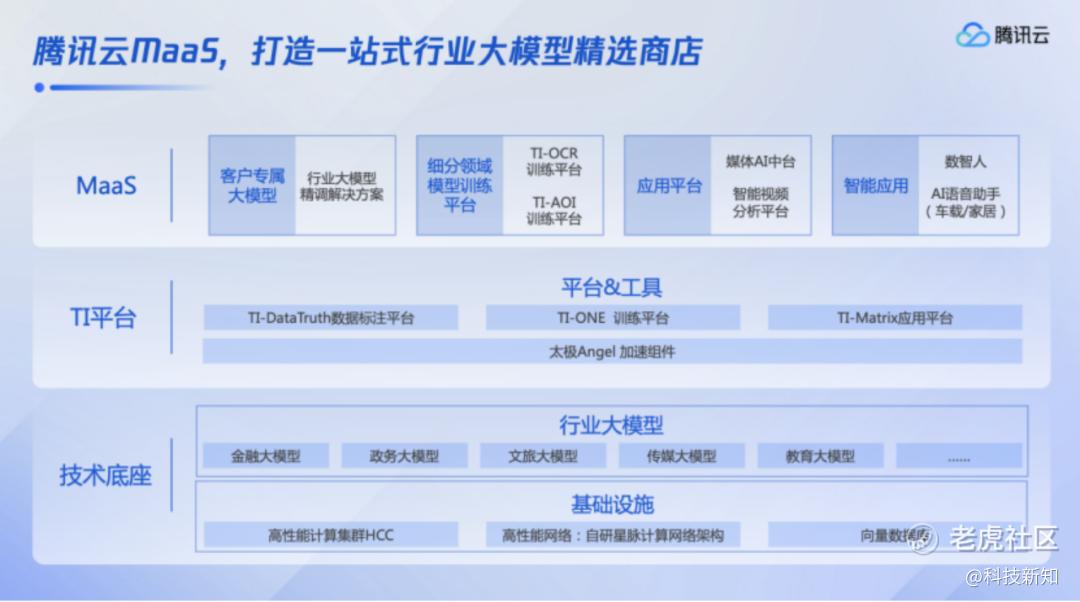 在应用层(MaaS)提供大模型微调、训练和应用等模型服务;在平台层提供数据标注和AI加速组件等工具,支持并加速企业大模型开发;在技术底座提供包括基础算力设施和内置的多个行业大模型。