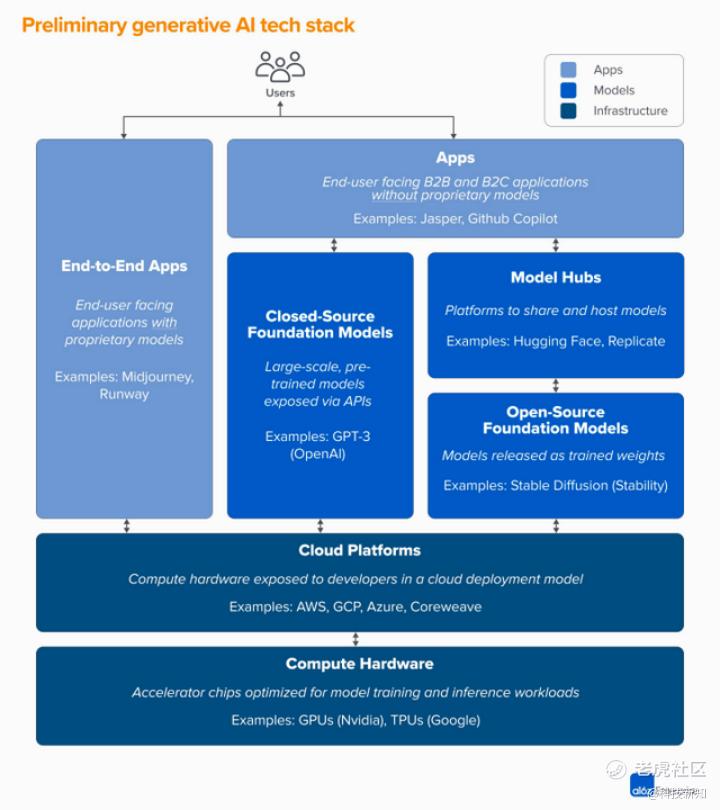 譬如,投资机构A16Z认为,生成式AI市场里的大量资金,其实最终流向了基础设施公司。A16Z估计,应用程序公司平均将约20%-40%的年收入,用于推理和定制化的微调。这部分通常直接支付给云服务提供商,以获取实例或支付给第三方模型提供商,后者将大约一半的收入投入于云基础设施。据此有理由推测,生成式AI总营收的10%-20%将流向云服务提供商。