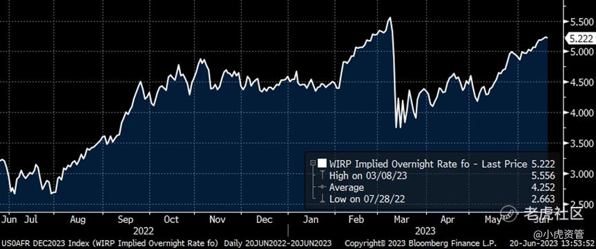 在6月FOMC会议上,美联储不出意外的暂停了加息。然而,美联储主席鲍威尔在随后的新闻发布会上表示,“此次暂停不意味着基准利率已经达到最高点”。同时发布的点阵图上则显示,FOMC委员们预期今年年底还要加息50bps(两次)。奇怪的是,市场似乎对如此鹰派的言论并不感冒, $标普500(.SPX)$ 只是在当天稍稍下跌“以表敬意”。从市场交易出来的Fed Fund Future来看,12月的预期基准利率不仅没有突破前高,还远低于美联储点阵图中位数的5.625%。