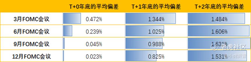 对于过去十年的FOMC所有的点阵图数据,我们分别计算了当年(T+0年)、明年(T+1年)和后年(T+2年)的点阵图预测偏差值,根据点阵图公布月份的平均值结果如下: