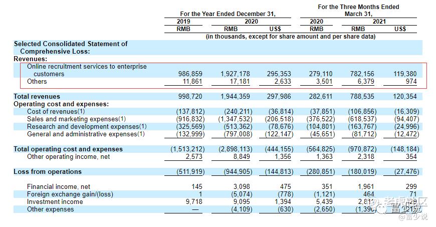 2019~2020年公司的营收分别为:9.99亿、19.44亿,复合年增率为94.7%。目前公司还未实现盈利,另外,BOSS直聘在2019年和2020年的研发投入分别为3.3亿元和5.2亿元,占当年营收的占比为32.6%和26.4%。