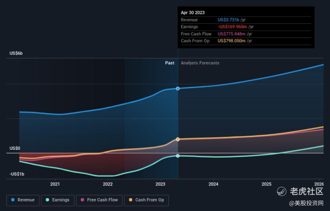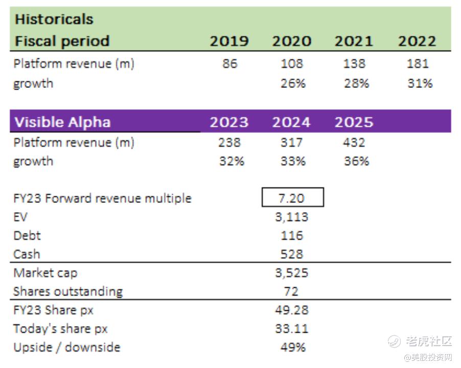 从负面来看,尽管PLTR第一季度的收入超出市场预期3.8%,但2023财年收入指导的中点仅从之前的22.05亿美元略微增加了0.2%,达到目前的22.1亿美元。这表明,考虑到宏观经济压力和政府相关项目的潜在资金缺口,Palantir管理层对公司的收入增长前景仍持谨慎态度。