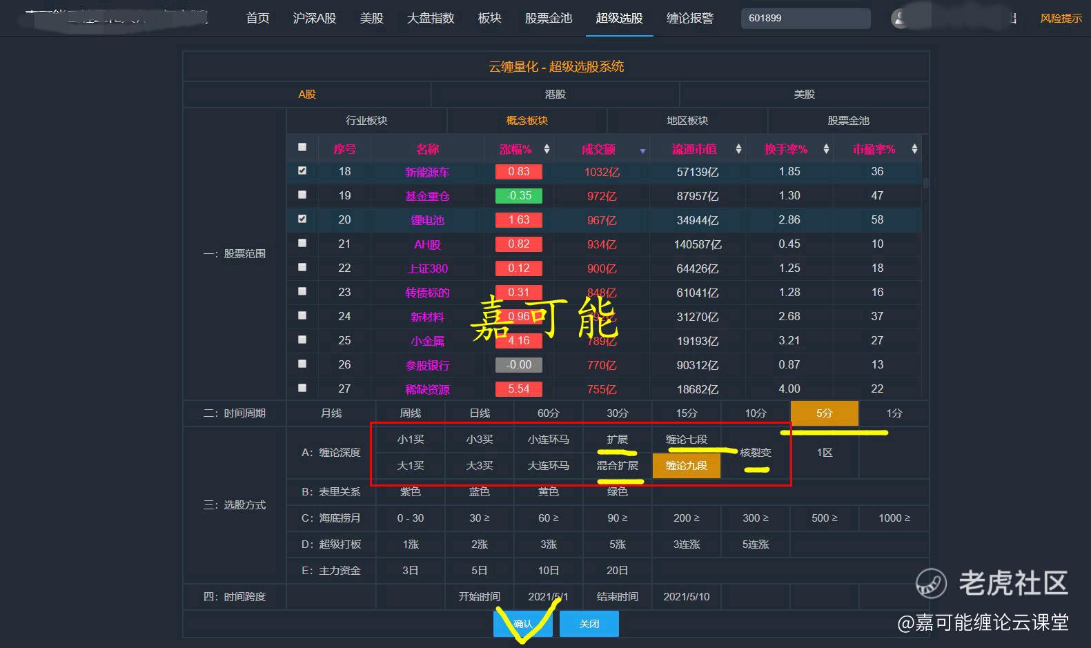 因此,在运用云缠大师进行短线选股的时候,需要注意选股的周期级别。大多数情况5分钟足以。如下图所示
