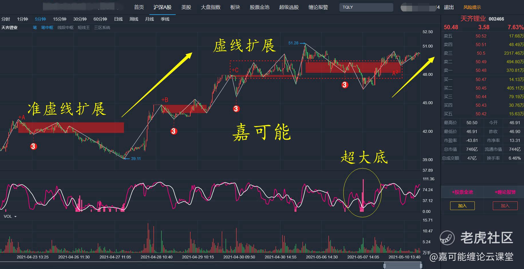 缠论虚线扩展+海底捞月超大底强势组合类型。天齐锂业(002466)也是收大阳线。