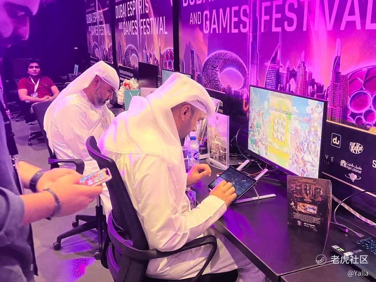 走进Yalla Group的专属展区,这些充满阿拉伯传统特色的巨幅宣传画吸引着过往观展人员的驻足。而显示器上正在进行的激烈攻防战更是牢牢抓住了他们的视线,让大家跟随着游戏进程一起鼓掌、欢呼,不知不觉被这两款游戏的独特魅力所征服,即使排长队也想亲自体验操作。
