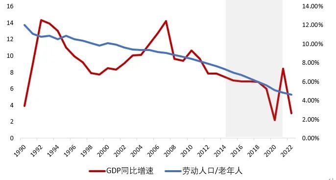 图2:中国人口结构变化预测 1990 - 2050数据来源:UN,World Bank, Wind。注:中国人口结构变化综合《中国人口预测报告2023版》及《中国发展报告2020》预测。新一轮劳动人口减少将对中国经济增速形成压力首先,从全球主要经济体的历史数据来看,当劳动力与老年人人口之比下降到7.5水平,该国GDP增长水平会出现明显下滑。日本在1950 年20-64岁劳动力人口与老年人人口比为10,此后的20年内GDP年均增速基本保持在10%以上(剔除石油危机年份)。然而,自1975年石油危机结束,日本劳动力与老年人人口比下降至7.5后,此后20年日本经济年均GDP增速基本斩腰(1975-1991年年均增速为4.4%)。类似的,中国台湾在1950年至1995 年期间,GDP 年均增长为8.6%,但随着1996年台湾劳动力与老年人人口比下降至7.5,此后20年间中国台湾的GDP年均增速为3.1%。韩国在1961-2002年GDP年均增速为8.95%, 2003年韩国20-64岁劳动力人口与老年人人口比降至7.5后,2003-2016年韩国年均GDP增速降至3.76%。2014年中国20-64岁劳动力人口与老年人人口比跌破7.5至7.4,这与日本1975年、韩国2003年、中国台湾1996年的情况基本类似,中国年均GDP增速在此后8年时间由前期年均的10.2%(2006-2013)下滑至6.88%(2014-2021)。更重要的,基于我们的分析,劳动力与老年人人口比的下滑对经济增长的影响存在非线性特征。随着劳动力与老年人人口比的进一步下滑,GDP中长期增速将继续重心下移。具体来说,我们发现当劳动力与老年人人口比再度降至4.8的水平,经济增长区间将再次发生趋势性下行。以日本,韩国,中国台湾为例,1992 年日本劳动力与老年人人口比跌破4.8,此后经济陷入“失去的二十年”,1992-2013年日本年均增速仅0.84%。韩国2017年劳动力与老年人人口比跌破4.8,2017-2022(剔除疫情三年)年均经济增速降至2.5%。中国经济在第一次跌破7.5的劳动/老年人口比时,经济增速已经由高速转向中高速。根据我们的估算,2021年中国劳动力人口与老年人人口比可能已经跌破4.8。如果基于人口结构变化与经济增长之间的规律,未来中长期中国经济增速可能将迎来再一次的趋势性重心小幅下移。确切来说,中国经济增速未来10-15年长期保持在4%-5%的区间水平可能将是新常态。此外,劳动人口下滑也会直接影响中国潜在经济增长率。国家统计局数据显示,2022年中国16-59岁劳动年龄人口为87556万人,占全国人口的比重为62.0%。相比2021年的88222万人,减少666万人,这相当于劳动力增长率为-0.83%左右。假定劳动力弹性是0.46(我们的估计),劳动力要素导致潜在增长率下滑约0.38%左右。长期来看,随着劳动力人口持续减少,劳动力要素可能将拖累潜在增长率年均下降0.88个百分点左右 (2023年-2035年)。图3:中国GDP增速vs劳动人口/老年人口比