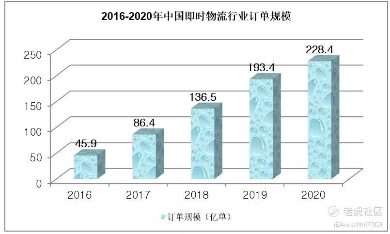 相关数据显示,即时配送用户规模已经超过4亿,从2016-2020年中国即时物流行业订单规模柱状图来看,我国的即时物流订单规模是逐年稳步增长的,2020年即时配送物流订单甚至突破200亿,高达228.4亿单。
