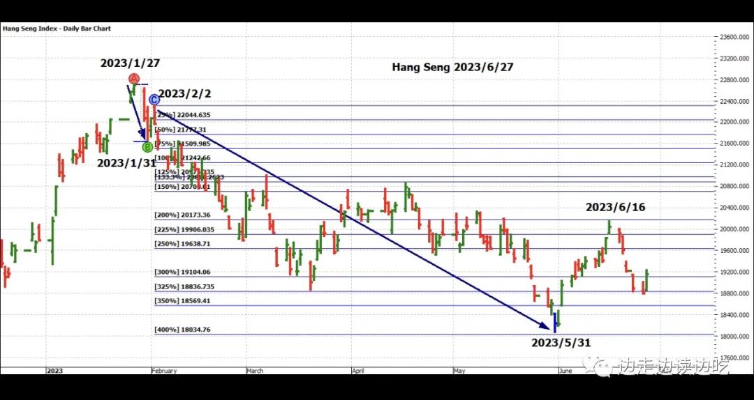 在本月19日,我们说恒生指数从下跌第二浪的200%阻力位下跌,并且跌破225%阻力位: