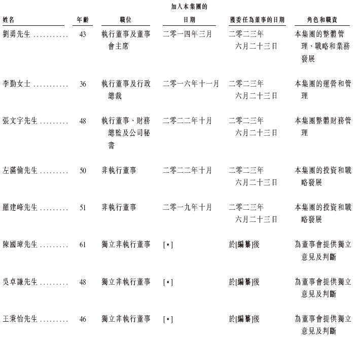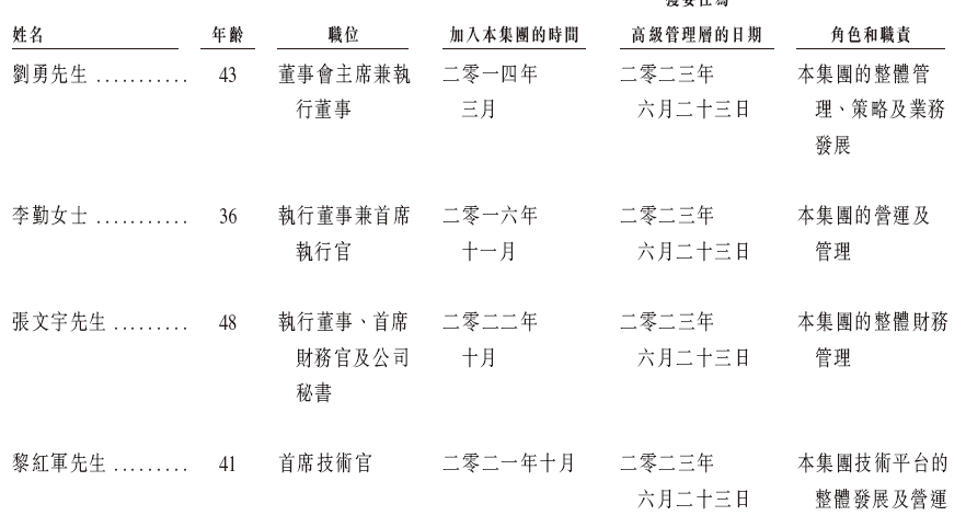 高管包括董事会主席刘勇先生,首席执行官李勤女士,首席财务官张文宇先生这3名执行董事,以及首席技术官黎红军先生。
