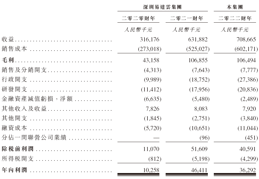 招股书显示,在过去的2020年、2021年和2022年三个财政年度,易达云的营业收入分别为人民币3.16亿、6.32亿和7.09亿元,相应的净利润分别为人民币1025.8万、4641.1万和3629.2万元。