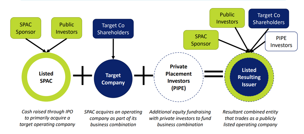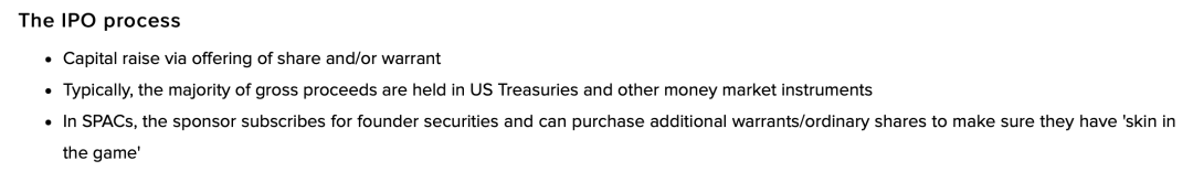 首先SPAC公司在创设后在交易所上市,此时其所募集资金一般存放在信托基金处,这些资金将被用于收购SPAC所关注赛道内的目标公司;目标公司通常在SPAC上市后的24个月(具体时间要求见各交易所相关规定)内通过De-SPAC(去SPAC化,通常为反向并购)步骤,最终将SPAC的境外市场上市身份“取而代之”。