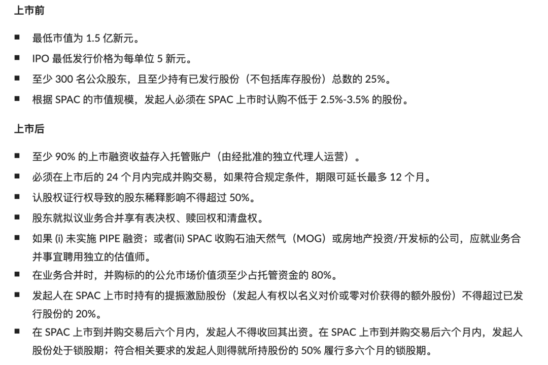 新加坡证券交易所(以下简称“SGX”或“新交所“)的SPAC上市条件对比联交所更为宽松,具体框架要求如下: