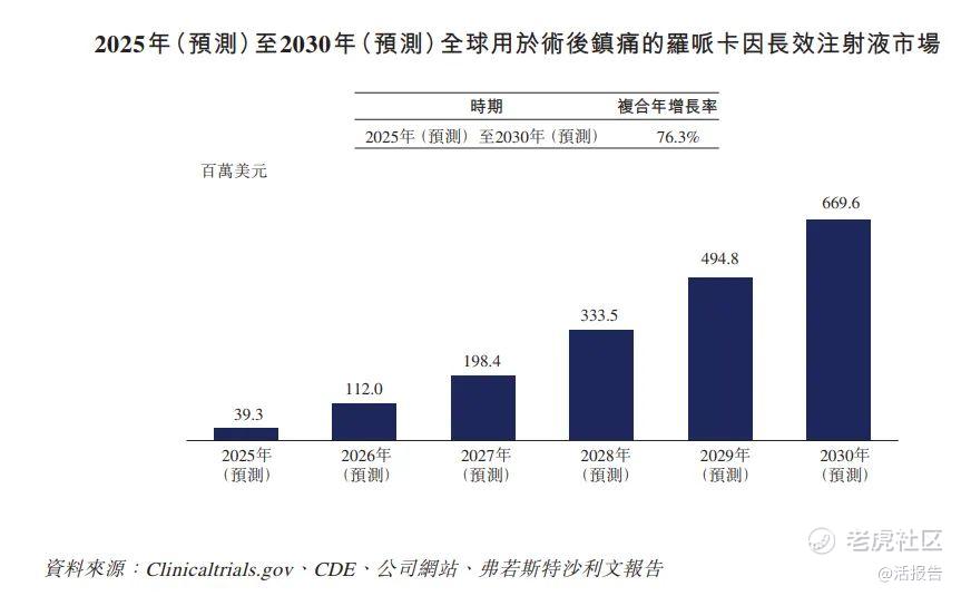 根据药物申请时间表,估计第一款用于术后镇痛的罗哌卡因长效注射液将于2025年获批准。于2025年至2030年,预计全球用于术后镇痛的罗哌卡因长效注射液潜在市场规模将由39.3百万美元增加至669.6百万美元,复合年增长率为76.3%。下表载列全球用于术后镇痛的罗哌卡因长效注射液市场于所示期间的预测规模: