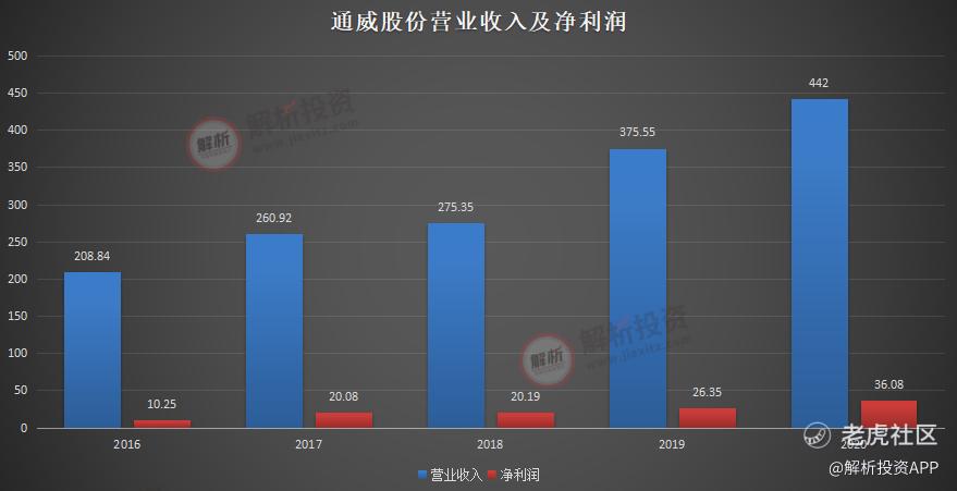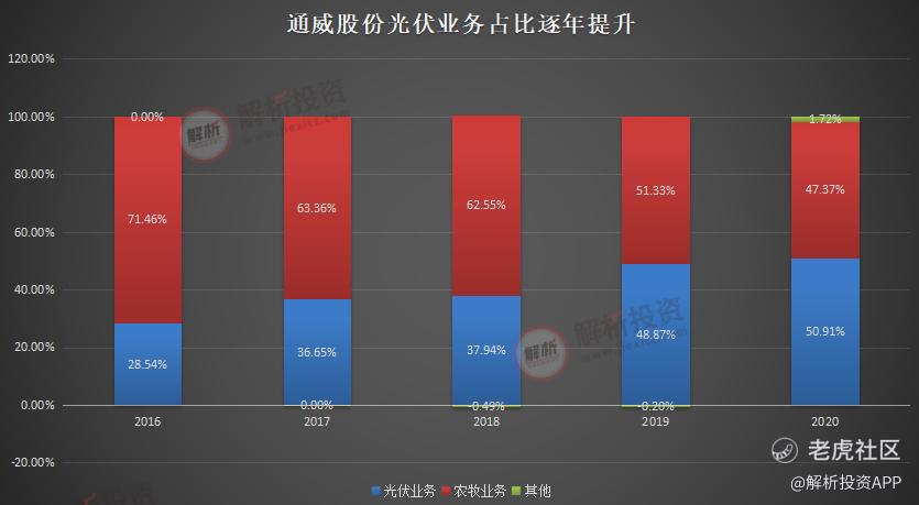2020年,通威股份农牧业务收入209.36亿元,占总营收的47.37%,光伏业务收入225.02亿元,占总营收50.91%。
