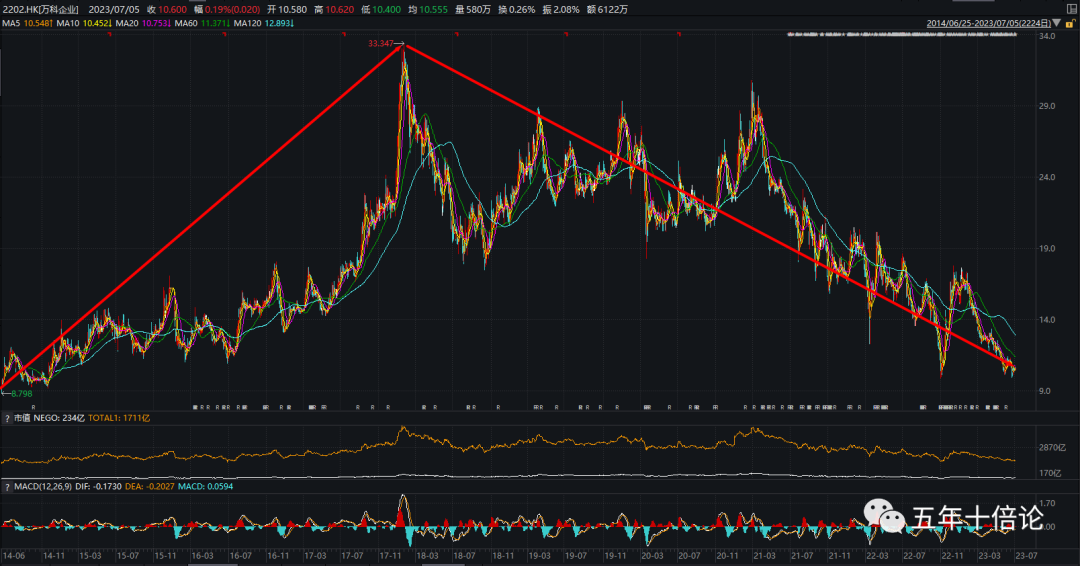 公司自14年在港股上市以来,最高市值出现在2018年1月初,最高市值4659亿港币,自2014年上市以来,上涨2.48倍。但是2018年后,随着房地产政策收紧,万科企业的股价一路下跌,当前市值1711亿港币,自最高点下跌幅度超过了67%!