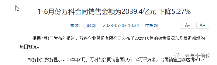 (1)公司销售额下滑,预期23年营收或进一步下滑。根据7月5日的消息,截至2023年1-6月,万科累计实现的合同销售面积为1297万平方米,合同销售金额为2039.4亿元,与去年同期相比下降了5.27%。可见2023年虽然疫情放开,但是并没有实质性好转,销售金额是营收的来源,销售金额的下滑,意味着营收也会大概率下滑。