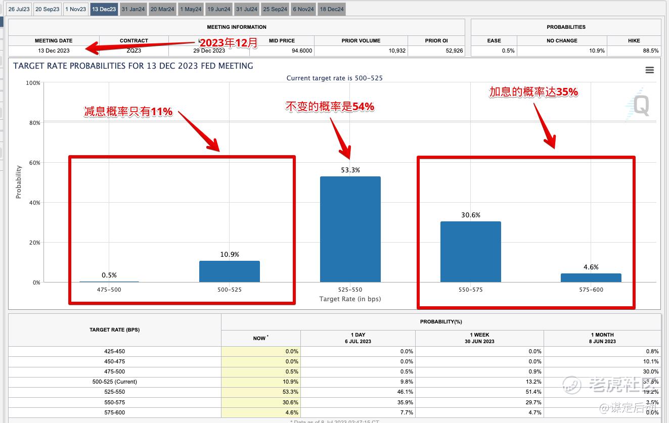 随着一系列经济数据公布,美国国债的基本面有了很大的改变,市场对于今年年底前减息的押注已经降低到11%了,而继续加息的概率高达35%,利率不变是大概率的54%。