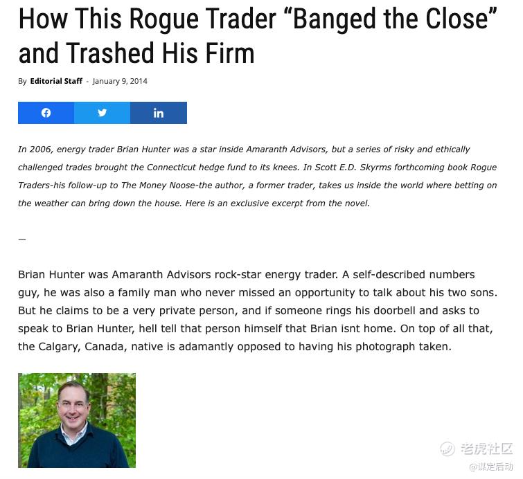 天然气交易员布莱恩·亨特(Brian Hunter)研究了美国历史上气温和天然气价格的变动规律之后,买入了行权价格很高的期权,2005年8月美国发生了一次历史级的大台风卡特里娜,造成天然气价格大涨,亨特获得了巨额的回报,一下子成了公司里的明星交易员,接着2006年他再次投入巨资做空短期天然气合约,做多远期天然气合约,年初几个月里他的判断完全正确,如果这时候离场,他一个人拿走的奖金将高达三亿美元,他也将成为华尔街的一个传说,但是他没有。