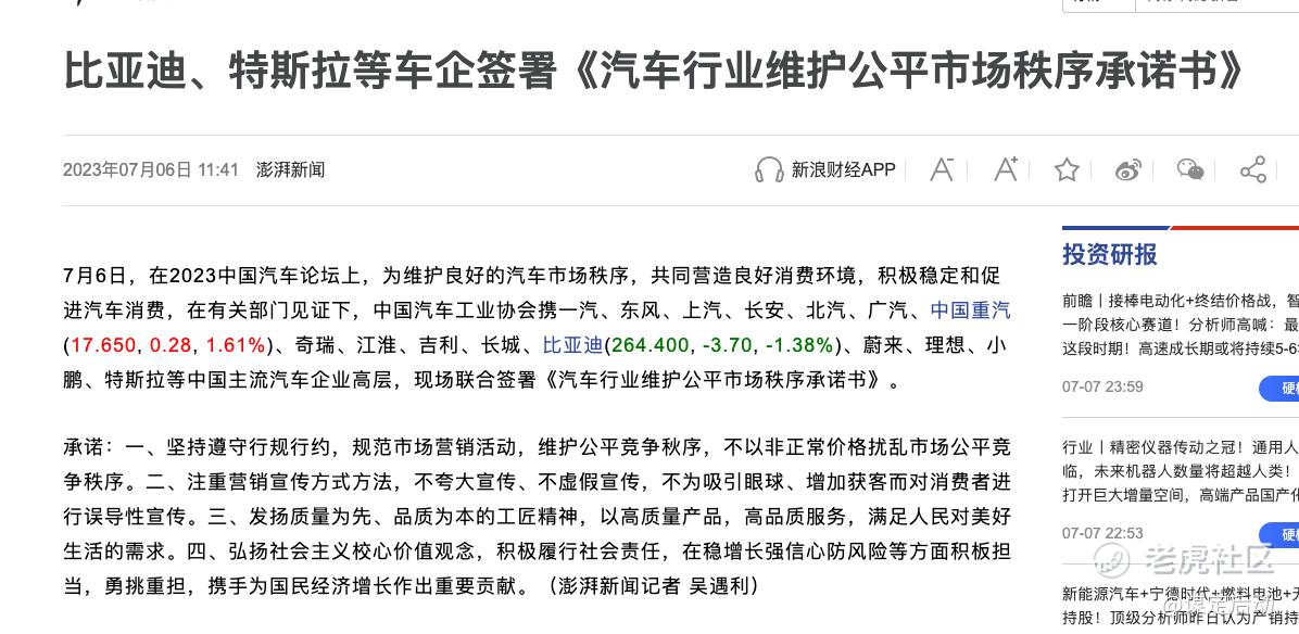 特斯拉签署了《汽车行业维护公平市场秩序承诺书》,简单地说,就是不许乱降价[捂脸]。