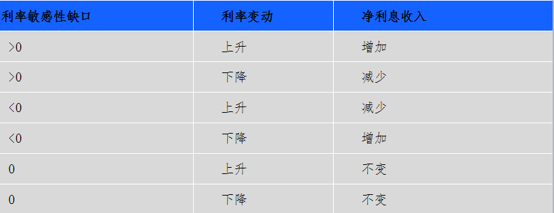 从盈利角度看,当某一时段内的利率敏感性缺口为负时,利率上升会导致净利息收入下降;反之,当利率敏感性缺口为正时, 利率下降会导致净利息收入下降;重定价期限越短,缺口越大,盈利受利率变动的影响越大。