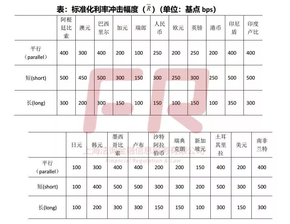 另外,新的监管还对各币种的标准化利率冲击幅度作了详细规定。相比过去巴塞尔的200BP标准冲击法,本次修订中人民币的利率冲击幅度最高要求需达300BP(短期利率变化)。
