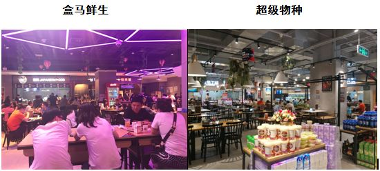而据盎司君的实地调研结果,盒马鲜生客流量不亚于一般超市,尤其用餐区,盒马鲜生可用“熙熙攘攘”来形容,座位需要排队等;而超级物种店内就清净许多,客流量明显不如盒马鲜生,用餐区人数更是寥寥无几。