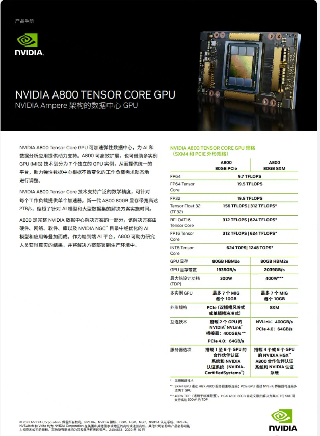 NVIDIA A800 Tensor Core GPU 是 NVIDIA 生产的一款深度学习加速卡,旨在绕过美国商务部的半导体出口新规(IT之家注:算力上限 4800 TFLOPS,带宽上限 600 GB/s)以取代 A100,这款产品已经在 2022 年三季度起投产。
