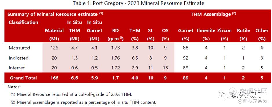 $HVY(+100.00%)Heavy Minerals Limited公告其Port Gregory石榴石项目的最新矿产资源估算为 166 Mt@ 4.0% (THM),2.0% THM cutoff grade。THM 的 89% 石榴石部分与之前的结果一致,导致含有 5.9 Mt石榴石,相当于当前全球约 5 年的需求。开始进行矿坑优化和矿山规划工作,以生成采矿清单,为即将进行的PFS提供资料。