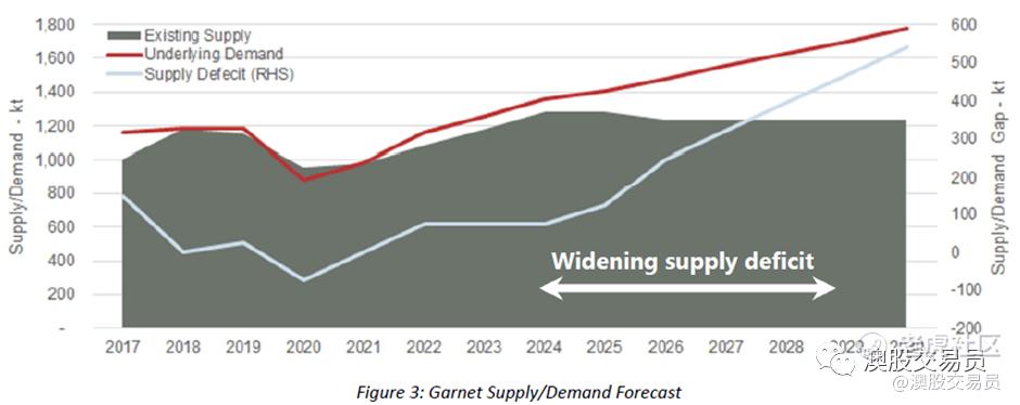预计未来几年工业石榴石需求将超过供应,并且从 2024 年起供应短缺预计将扩大。定价也做出了相应的反应,美国石榴石价格同比上涨 20%, 2021 年达到每吨 325 美元(石榴石精矿)。Port Gregory地区未来生产的冲积铁铝榴石石榴石将缩小全球供应缺口,并可能取代劣质硬岩石榴石。
