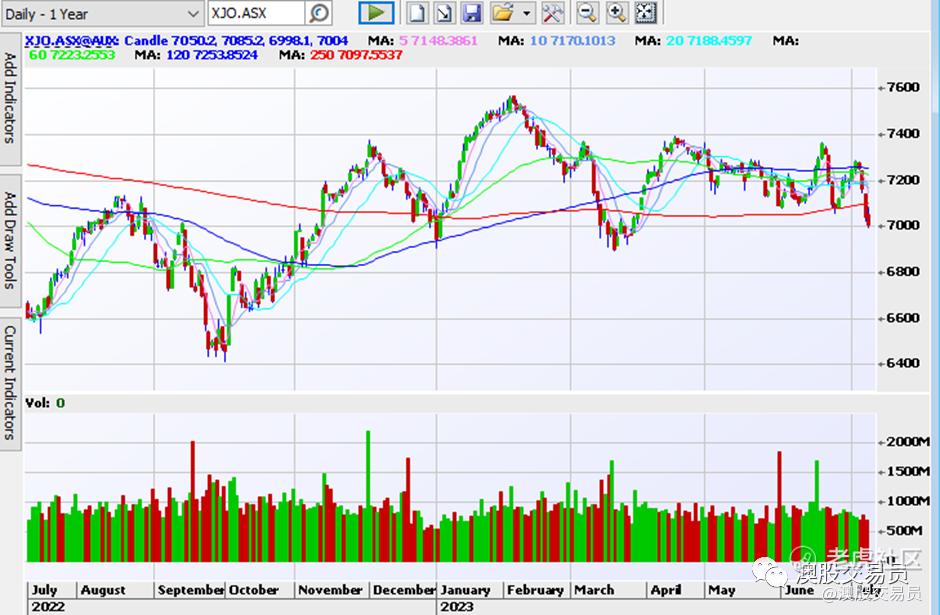 今日ASX200指数早盘上涨0.6%之后转跌,最终收于7004点,跌幅-0.54%。中国 6 月份 CPI 为 0%,远低于预期的 +0.2%,6月PPI同比下降5.4%,为2015 年 12 月以来的最快跌幅,表明经济的疲软。摩根士丹利看多保险经纪公司,瑞银将 ASX 200 的2023 和 2024 财年同比盈利增长率分别下调 0.6% 和 1.4%,2024 财年 ASX 200 每股收益同比增长预测现为 -3.2%。
